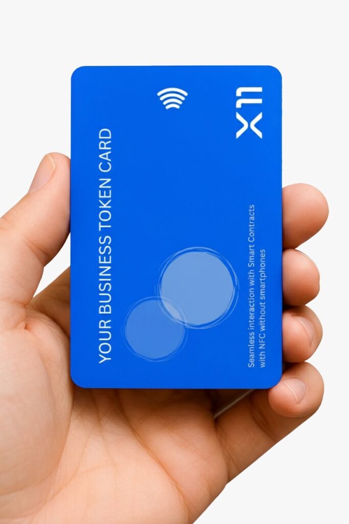 X11 Smart Contract Cards unlock blockchain for everyday users in developing markets, where smartphone apps are not suitable. Tap an NFC-enabled card on any X11-compatible POS terminal to sign transactions—no app, no internet, no barriers—making crypto as simple as swiping a debit card.