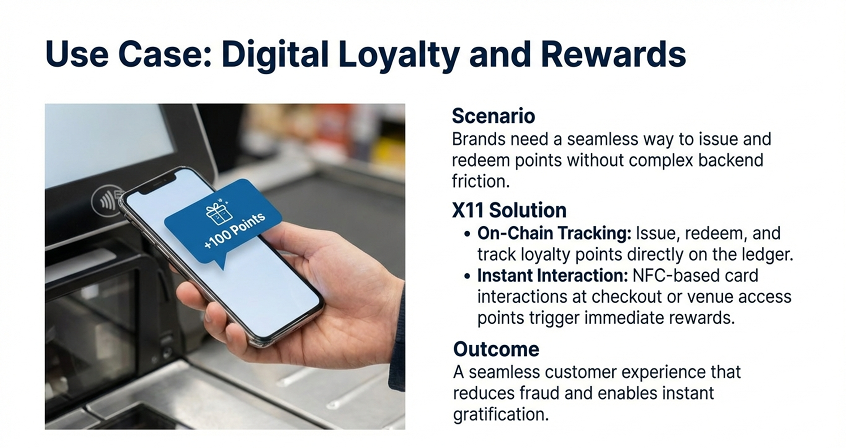 X11 connects “phygital” experiences by integrating NFC-based cards and devices. Real-world actions—like tapping a card—trigger verified on-chain transactions for loyalty programs, vouchers, access control, or identity verification.
